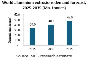 The demand for aluminium extrusions across the globe is projected to grow at about 3.6% annually, to reach around 40.5 million tonnes by 2030. The outlook for aluminium extrusions demand needs to be tempered by the recent geopolitical tensions and policy uncertainty around emission targets across countries. In addition, protectionist measures and evolving carbon regulations across regions could influence the market dynamics.