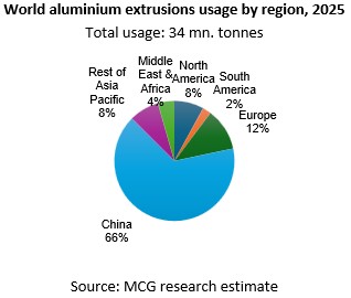 The aluminium extrusions market across the world is growing, driven by demand from construction, automotive and industrial sectors. Growth in renewable energy and the increasing focus on energy efficiency and emissions reduction are also supporting demand. Between 2015 and 2025, global aluminium extrusion demand rose at about 4% per annum, increasing from 23.3 million tonnes to about 34 million tonnes in 2025. China accounted for about 66% of global extrusion usage, followed by Europe, North America and the rest of Asia-Pacific. On the supply side, the industry is focusing on recycled and low-carbon billet production, alongside investments in larger, higher-capacity presses to enable production of more complex and high-strength profiles.